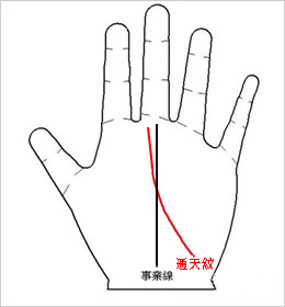 有些人容易将事业线与通天纹混淆在一起,其实两者是有差别的,事业线的起始点通常是在手掌的根部,又称为“玉柱纹”,而通天纹的起点则是在月丘。不过,也可以将通天纹看作是一条特别的事业线,因为生有这条线的人本身就有着很好的事业运。只是,比单纯拥有事业线的人,更多了一份灵气,第六感更强一些。而且拥有通天纹的人,通常对玄学或神秘事物有着天生的兴趣,天生与神佛有缘。所以,人们才说这类人有沟通天地的能力,其实就是对一些神秘事物有一些感应能力吧。