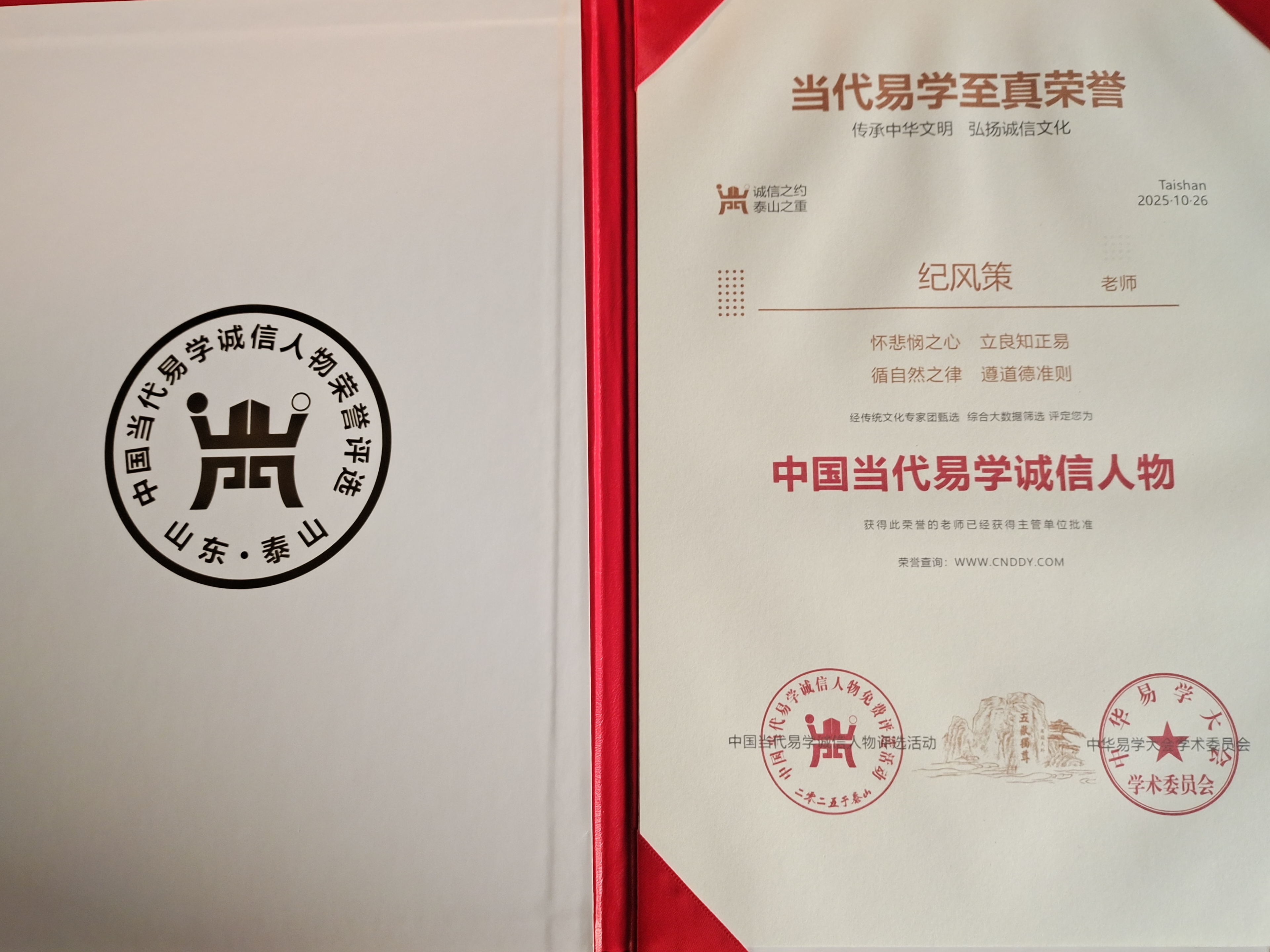 10月25-28日,纪风策老师在山东泰安,出席2025第十九届中华易学大会,并获得当代易学至真荣誉“中国当代易学诚信人物”。