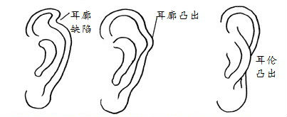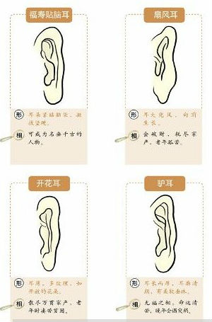 耳形耳朵可分为水耳、土耳、金耳、圆棋耳、贴脑耳、对面不见耳等,这种耳朵都比较完美;若是鼠耳、木耳、火耳、箭耳、猪耳、轮廓外反戴者是低于眼睛的都不是太好的,这种耳形的人往往童年不顺利,家运多磨难,六亲不利。